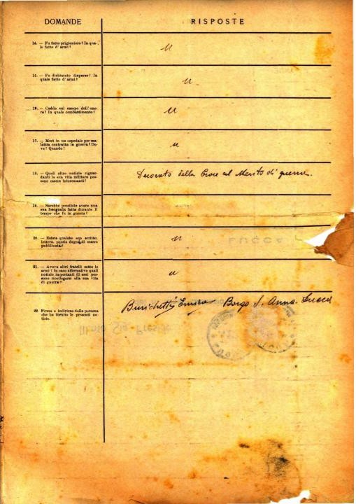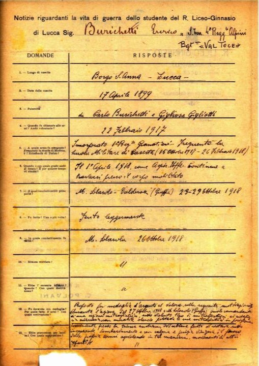 Enrico Burichetti non ebbe la Medaglia d’Argento, come proposto nel questionario, ma nel 1920 gli fu tributata invece la Medaglia di Bronzo al Valor Militare come si evince dal
