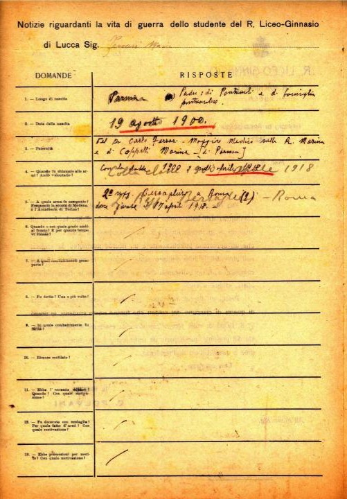 N.B. Il 29 marzo 1918 aveva  avuto la licenza liceale nel R. Liceo - Ginnasio della Spezia e si era inscritto nella facoltà di legge nella R. Università di Pisa.
