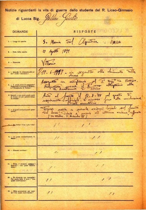 Andò al fronte il 12-8-’18 col grado di aspirante-ufficiale. Vi rimase fino alla conclusione dell’ armistizio.